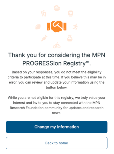 Because of how the MPN PROGRESSion Registry™ is designed, there are certain eligibility requirements participants must meet in order to enroll. If you do not meet the study criteria and are designated ineligible for participation at this time, please know how much we appreciate your interest. We hope you’ll stay connected with our community. Your involvement is important to us.